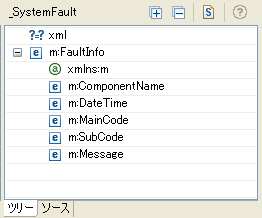 メッセージには[フォルトのスロー]アクション設定時に定義したエラーメッセージが入ります(「フォルトのスロー」を参照)。[フォルトのスロー]アクションにエラーメッセージを指定していない場合は、「ユーザ定義のフォルトが発生しました!」というメッセージが表示されます。。[試行/フォルト時]アクション内でエラーが発生したが、フォルトを指定していなかった場合、この要素には例外メッセージが入ります。