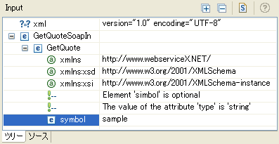 入力ビューには、WebサービスのWSDLドキュメントから派生した入力メッセージが表示されます。右側の境界線をドラッグすると、ビューのサイズを変更できます。列の境界線をドラッグすると、ビュー内の列のサイズを変更できます。アクションモデルのテストで使用する値を入力パートに直接指定できます。この場合、指定した値はアクションモデルの実行後に破棄されます。タブを使用して値を指定することもできます(「セクション 9.4.4, メッセージ」を参照)。この場合、指定した値は値を削除するか、アクションモデルを再生成するまで保持されます(「セクション 9.4.5, アクションモデルのコードの再生成」を参照)。