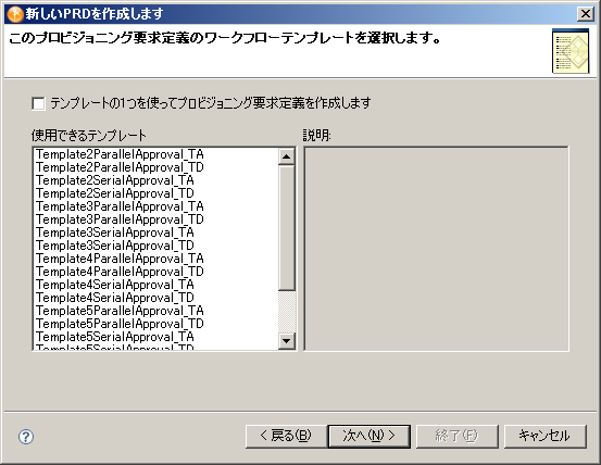 プロビジョニング要求定義をテンプレートに基づいて作成する場合は、を選択し、リストから、使用するテンプレート(TemplateSingleApproval_TAなど)を選択して、をクリックします。