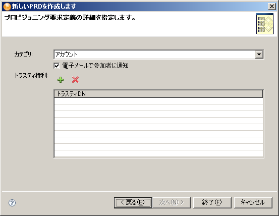 ウィザードの次のパネルを使用して、展開後のプロビジョニング要求定義にアクセスできるトラスティ(ユーザ)を指定します。