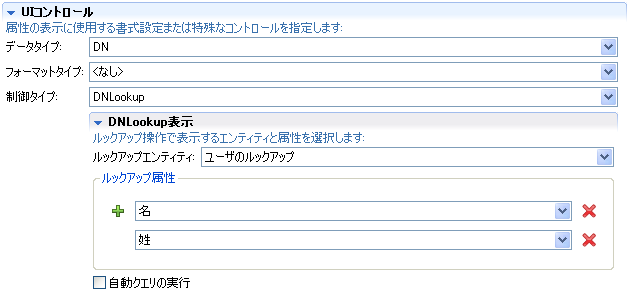 を指定した場合、オブジェクトセレクタのコンテンツは、属性の[DNLookup ]コントロールタイプの定義(ディレクトリ抽象化レイヤ内)により定義されます。たとえば、ユーザエンティティをオブジェクトルックアップに指定し、マネージャを属性に指定した場合、オブジェクトセレクタはマネージャの[DNLookup]コントロールタイプ定義を使用してルックアップ条件を決定するので、ユーザは[名]属性と[姓]属性で検索できます。 マネージャエンティティの[DNLookup]定義を図 6-31に示します。