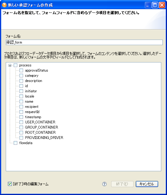 データ項目リストからフォームに含めるデータ項目を選択し、[完了]をクリックします。[承認フォーム]ウィザードは、選択したデータ項目それぞれを、新しいフォームの文字列タイプフィールドとして生成します。 承認アクティビティはフォームが関連付けられている必要があります。フォームが指定されていない場合、ランタイム時にエラーメッセージが表示されます。 |