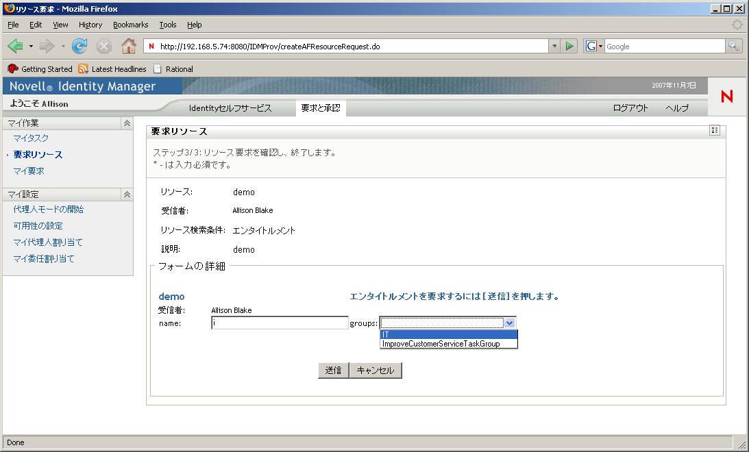 ユーザが入力した値に一致するグループだけを返すクエリを、[グループ]コンテナで実行することもできます。図 6-7に示した例では、ユーザは名前フィールドに値を入力します。ユーザがタブで次のフィールドに移動すると、ドロップダウンリストのコンテンツは、カスタムイベントで開始したクエリから取り込まれます。