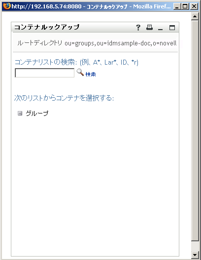 : [オブジェクトセレクタ]ダイアログボックスでオブジェクトルックアップを実行します。プロパティを介してルックアップ条件を指定します。 : オブジェクトセレクタで1つ以上のコンテナを選択対象として表示します。検索対象のコンテナは、プロパティによって決定されます。このプロパティは、プロパティで名前が付けられたエンティティに対して、ディレクトリ抽象化レイヤで指定されます。たとえば、プロパティが「グループ」である場合、検索コンテナはデフォルトで「%group-root%」に設定されます。検索コンテナが使用されない場合、ユーザアプリケーションのインストール中に指定された検索ルートが使用されます。 |