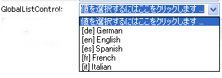 このコントロールを使用して、ユーザがドロップダウンリストから単一のエントリを選択できるようにします。リストのコンテンツは、ディレクトリ抽象化レイヤのグローバルリスト要素で定義されます。