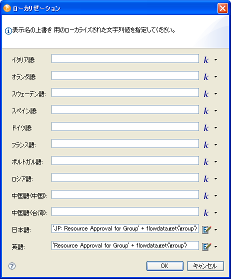 プロビジョニング要求定義の表示名を上書きできます。これは、ユーザがまたはを選択したときに列で表示される名前です。名前は定数にもECMA式の結果にもすることができ、サポートされるロケールごとにローカライズできます。定数またはECMA式を指定するダイアログボックスにアクセスするには、列のボタンをクリックします。