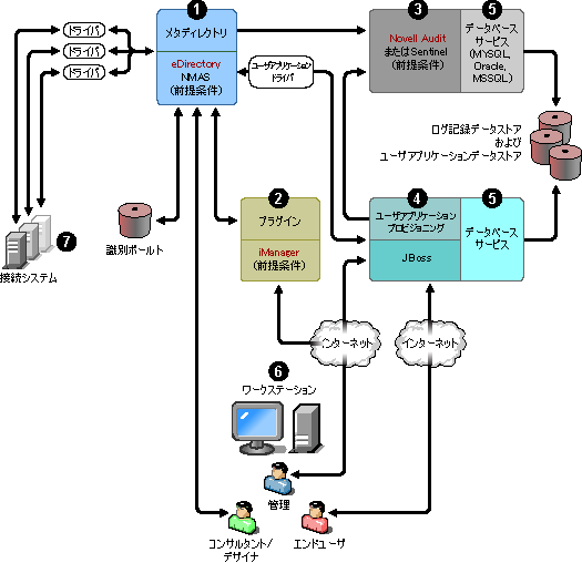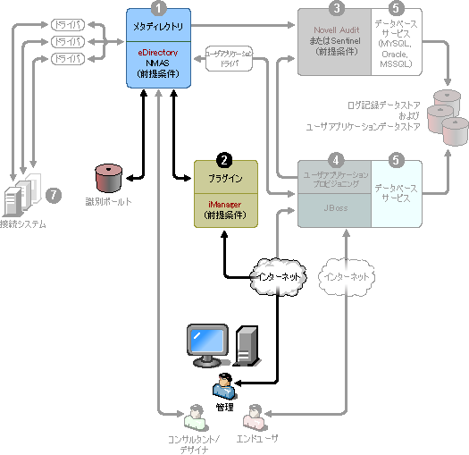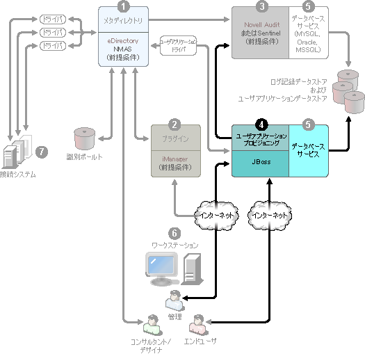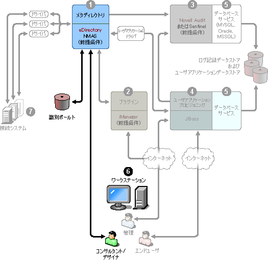 メモ:Identity Managerコンポーネントをインストールする前に、まずeDirectory 8.7.3.6以上(上の図で1番および3番で示されているサービス)、Security Services 2.0.4とNMAS 3.1.3 (1番および3番)、iManager 2.6以上(2番)、およびNovell Audit 2.0.2スターターパックまたはSentinel 5.1.3 (3番)などのインストールに必要なソフトウェアをインストールする必要があります。必要なソフトウェアは、NovellのダウンロードWebサイトから入手できます。必要なソフトウェアおよび要件の詳しいリストについては、セクション 1.5, Identity Managerのシステム要件を参照してください。