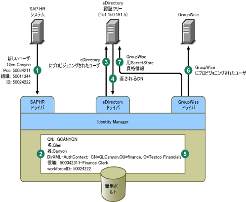 図 4-1は、一般的なシナリオを簡略に示したものです。このシナリオでは、Single Sign-Onの資格情報をGroupWise®の新規ユーザにプロビジョニングしています。この部署では、SAP HRシステムとIdentity Managerを使用して、識別ボールト内に新しいユーザをプロビジョニングします。組織の情報に基づき、ユーザは、eDirectory™内に実装された部署の認証ツリー内にプロビジョニングされます。ここが新しいユーザがネットワークに対して認証される場所であり、会社のファイアウォールの外から安全なSingle Sign-On機能を提供するために、Novell iChain®またはNovell Access Manager™によって使用されるGroupWiseセキュリティの資格情報リポジトリになります。ユーザは続いて、Identity ManagerによってGroupWiseにプロビジョニングされ、それらのシステムの資格情報は、認証ツリー内のSecretStore属性に同期されます。