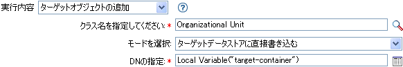 指定したタイプのオブジェクトをターゲットデータストアに作成します。名前と場所には、[]フィールドで指定した名前と場所を使用します。オブジェクト作成の一部として追加される任意の属性値は、この後のターゲット属性値の追加アクションで同じDNを使って追加する必要があります。
