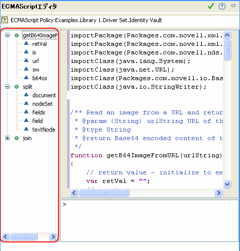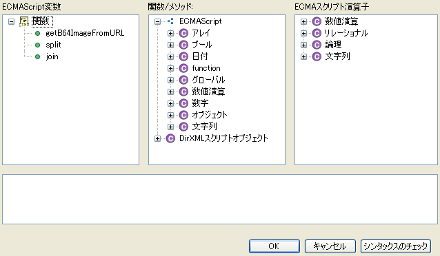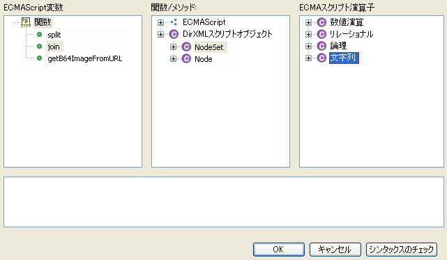 []は、ECMAScript内の現在の定義済関数すべてを一覧表示します。 []は、標準ECMAScript関数とDirXMLスクリプト関数を含んでいます。[]は、標準ECMAScript演算子を表示します。