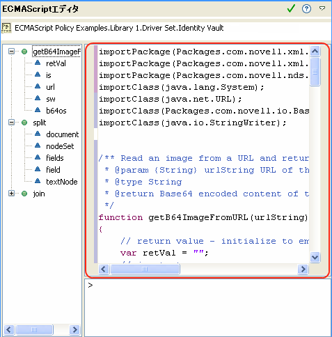 ECMAScriptエディタは、ECMAScriptが作成されるメインスクリプト記述エリアを提供します。 新しいスクリプトを入力するか、または既存のスクリプトをコピーできます。