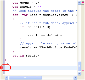 ECMAScriptが作成されると、メインスクリプト記述エリアおよび[]ビューにエラーが表示されます。メインスクリプト記述エリアは、エラーが発生した行に赤いXでエラーを表示します。