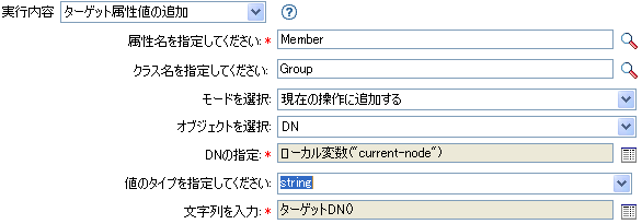 ターゲット属性値の追加アクションを定義するには、アクションビルダを起動するアイコンをクリックします。アクションビルダで、目的のアクションを定義します。次の例では、メンバー属性が、追加された各Groupエンタイトルメントのターゲットオブジェクトに追加されます。
