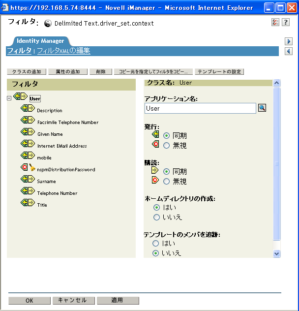 フィルタエディタには、識別ボールトと接続システム間の情報の同期方法を変更するオプションがあります。フィルタの設定は、クラスと属性で異なります。