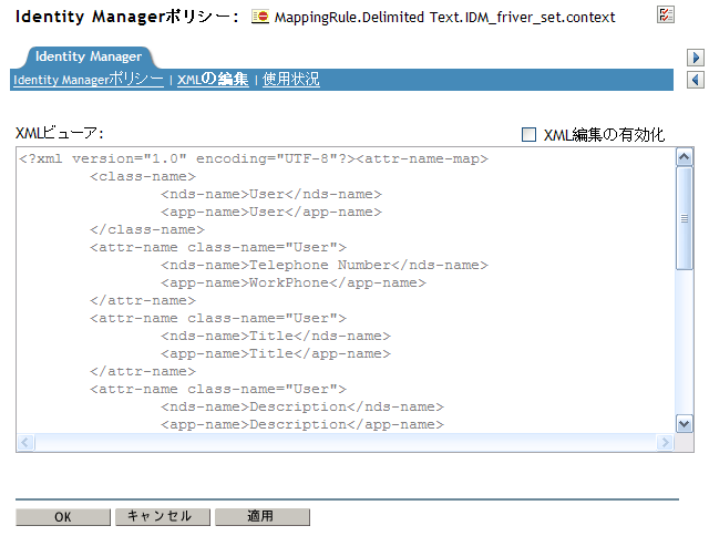 [XML編集の有効化]をクリックすると、DirXML®スクリプトポリシーを編集できます。DirXMLスクリプトを変更し、[