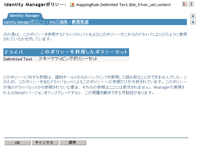 このポリシーを現在参照しているドライバのリストを表示します。リストでは、このポリシーのドライバセット内のポリシーだけを参照します。このポリシーが別のドライバセットから参照されていても、その参照はここには表示されません。