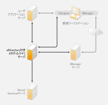 作業負荷に応じて、Identity Managerソリューションに1つ以上のメタディレクトリサーバを用意することができます。図 3-3に示すように、メタディレクトリサーバにはeDirectoryがインストールされている必要があります。図には示されていませんが、リモートローダを追加すると、現在の環境の作業負荷および設定に役立ちます。