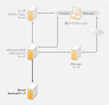 Identity Managerソリューションの一環として監査とレポートが必要である場合、Identity AuditまたはNovell Sentinel™を実装する必要があります。図 3-8で示されているように、Identity AuditまたはSentinelは専用のサーバで実行することをお勧めします。ソリューションに必要なサーバの数は、現在の環境内にあるドライバの数と、監査するように定義したイベントの数によって決まります。