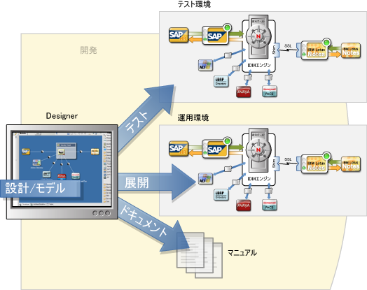 DesignerはEclipse*ベースのツールで、Identity Managerシステムの設計、展開、および文書化に使用します。Designerのグラフィカルインタフェースを使用すると、オフライン環境でシステムを設計およびテストしたり、システムを運用環境に展開したり、展開システムの詳細をすべて文書化したりすることができます。
