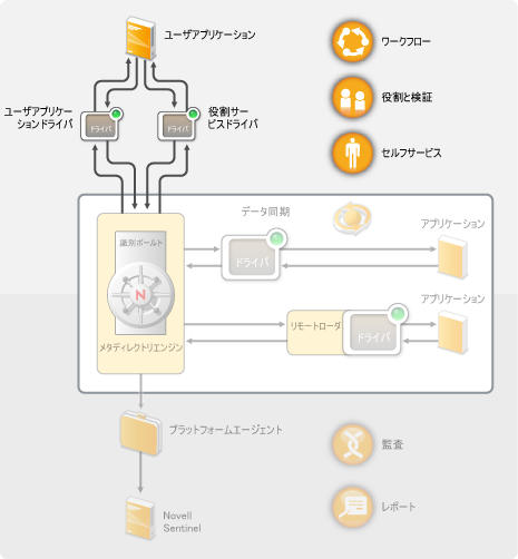 ユーザアプリケーション: ユーザアプリケーションはブラウザベースのWebアプリケーションで、ユーザおよびビジネス管理者に、さまざまな識別セルフサービスおよび役割のプロビジョニングのタスクを実行する機能を提供しています。このタスクには、パスワードおよび識別データの管理、プロビジョニングおよび役割の割り当て要求の開始および監視、プロビジョニング要求の承認プロセスの管理、検証レポートの確認などがあります。これには、アプリケーションの承認プロセスを通じて要求のルーティングを制御するワークフローエンジンがあります。