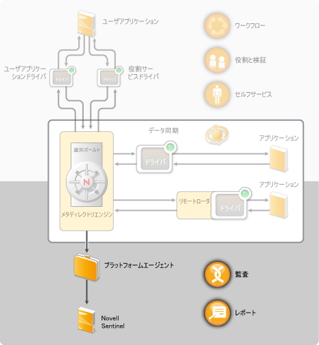 監査とレポートは、以下の図に示されているようにNovell Sentinel™との統合によって提供されています。