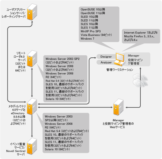 Novell Identity Managerコンポーネントは複数のシステムおよびプラットフォームにインストールすることができます。