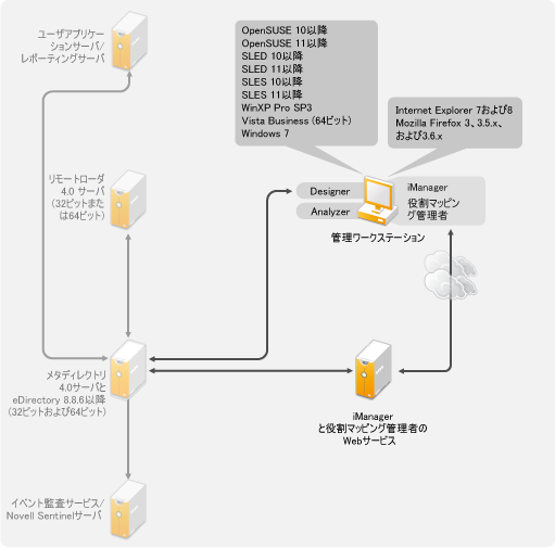 ワークステーションは、Designer、iManager、役割マッピング管理者、ユーザアプリケーション管理Webページにアクセスするのに使用されます。図 6-6は、Identity Manager 4.0でサポートされているワークステーションのさまざまなコンポーネントを一覧表示しています。