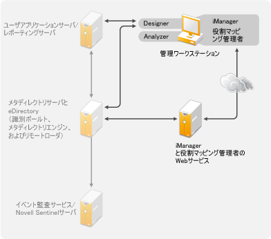 常に10名を超える管理者が同時にiManagerで作業する場合は、iManagerをホストする専用サーバを用意することをお勧めします。図 3-2は、このIdentity Managerソリューション設定を示しています。管理者が1人だけの場合、メタディレクトリサーバで問題なくiManagerを実行できます。