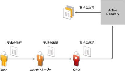 Identity Managerには、プロビジョニングプロセスで適切なリソース承認者を要求するワークフロー機能が備わっています。たとえば、Active Directoryアカウントですでに設定されているJohnがActive Directoryを使用して一部の財務レポートにアクセスする必要があるとします。ここでは、Johnの直接のマネージャとCFOの両方からの承認が必要です。幸いにも、Johnの要求をマネージャに転送し、マネージャからの承認後にCFOに転送する承認ワークフローがセットアップされています。CFOによる承認で、Johnが経理ドキュメントのアクセスおよび表示を行うのに必要なActive Directory権限の自動プロビジョニングがトリガされます。