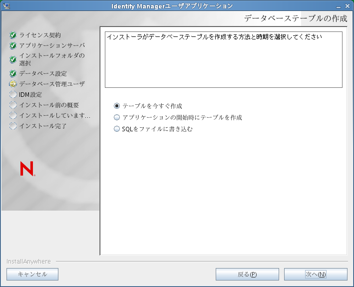 インストーラは、直接テーブルを作成するため、および.SQLファイルを作成するための両方の場合にデータベースに接続する必要があります。データベース接続をテストして、それが失敗した場合でも、インストールを続行できます。その場合、『ユーザアプリケーション: 管理ガイド』で説明されるように、インストール後にテーブルを作成する必要があります。 |