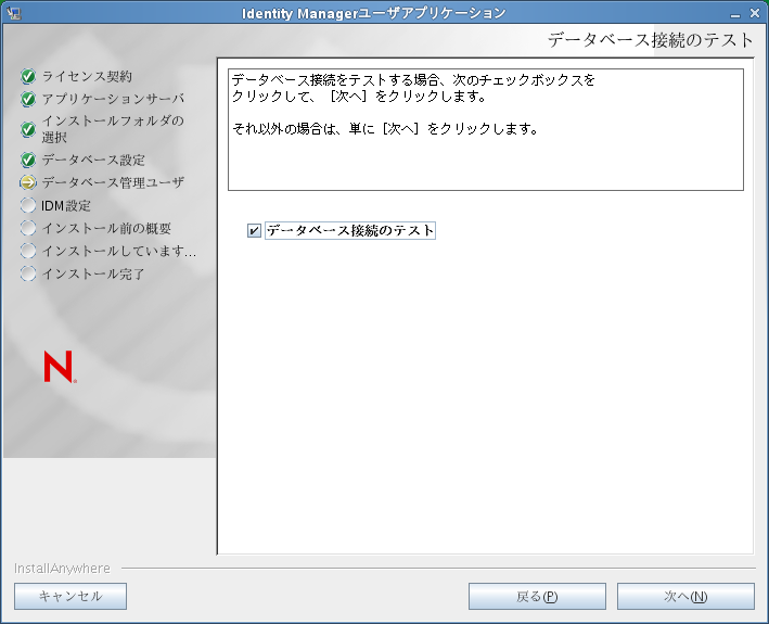 前の画面で指定した情報が正しかったことを確認するには、チェックボックスをオンにしてデータベース接続をテストします。