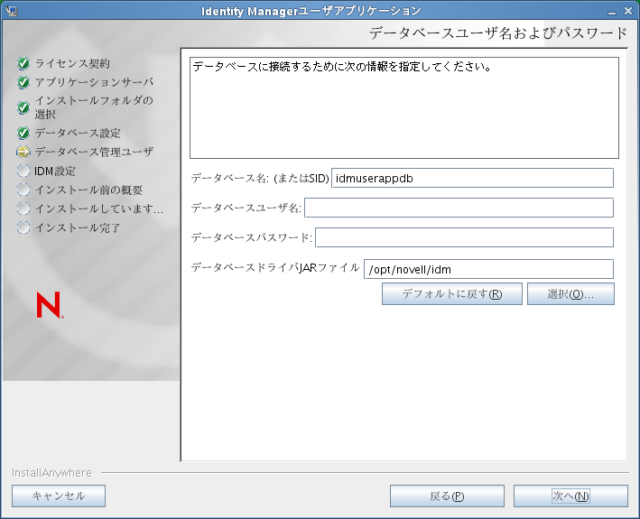 (またはSID): MS SQL ServerまたはPostgreSQLでは、事前に設定したデータベース名を入力します。Oracleの場合は、前に作成したOracleシステムID (SID)を指定します。クラスタでは、クラスタの各メンバーには同じデータベース名またはSIDを指定します。 : データベースユーザを指定します。クラスタでは、クラスタの各メンバーには同じデータベースユーザを指定します。 : データベースパスワードを指定します。クラスタでは、クラスタの各メンバーには同じデータベースパスワードを指定します。 : データベースサーバにシンクライアントJARを指定します。これは必須です。