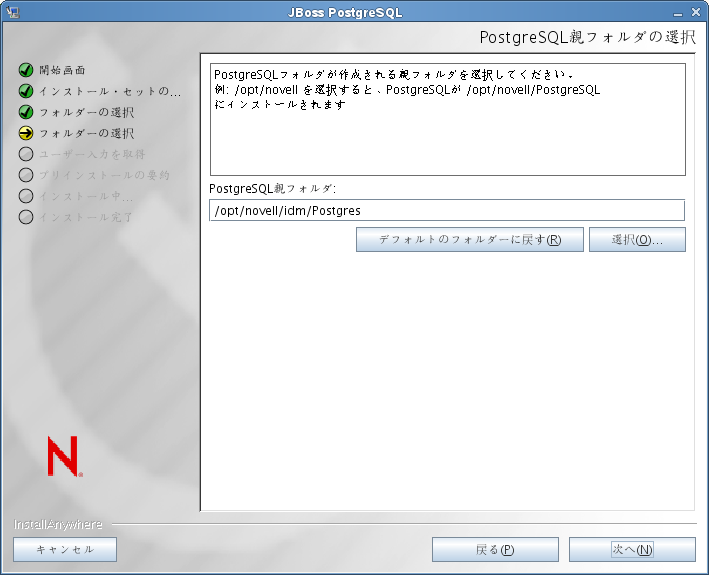 選択した製品がインストールされると、ユーティリティでは正常に完了したことを示す次のメッセージが表示されます。 The Installer has completed successfully. Thank you for choosing Novell インストーラはnovluaユーザを作成します インストーラはnovluaという名前で新しいユーザを作成します。jboss_initスクリプトは、JBossをこのユーザで実行し、JBossファイルで定義されている権限がこのユーザに設定されます。 重要:JBossPostgreSQLユーティリティがJMXコンソールまたはJBoss Webコンソールを保護しないことに注意する必要があります。これにより、JBoss環境は無防備なままになります。セキュリティ上の危険を排除するために、インストールを完了し時点で直ちに環境をロックダウンする必要があります。 |