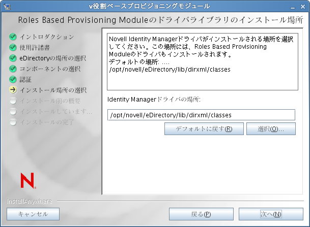 ユーザ資格情報が有効な場合、またはユーザが適切な権限を持っている場合、インストーラにより[Roles Based Provisioning Moduleのドライバライブラリのインストール場所]画面のインストール場所が表示されます。