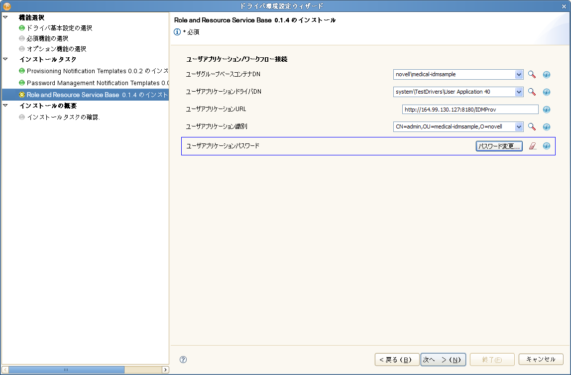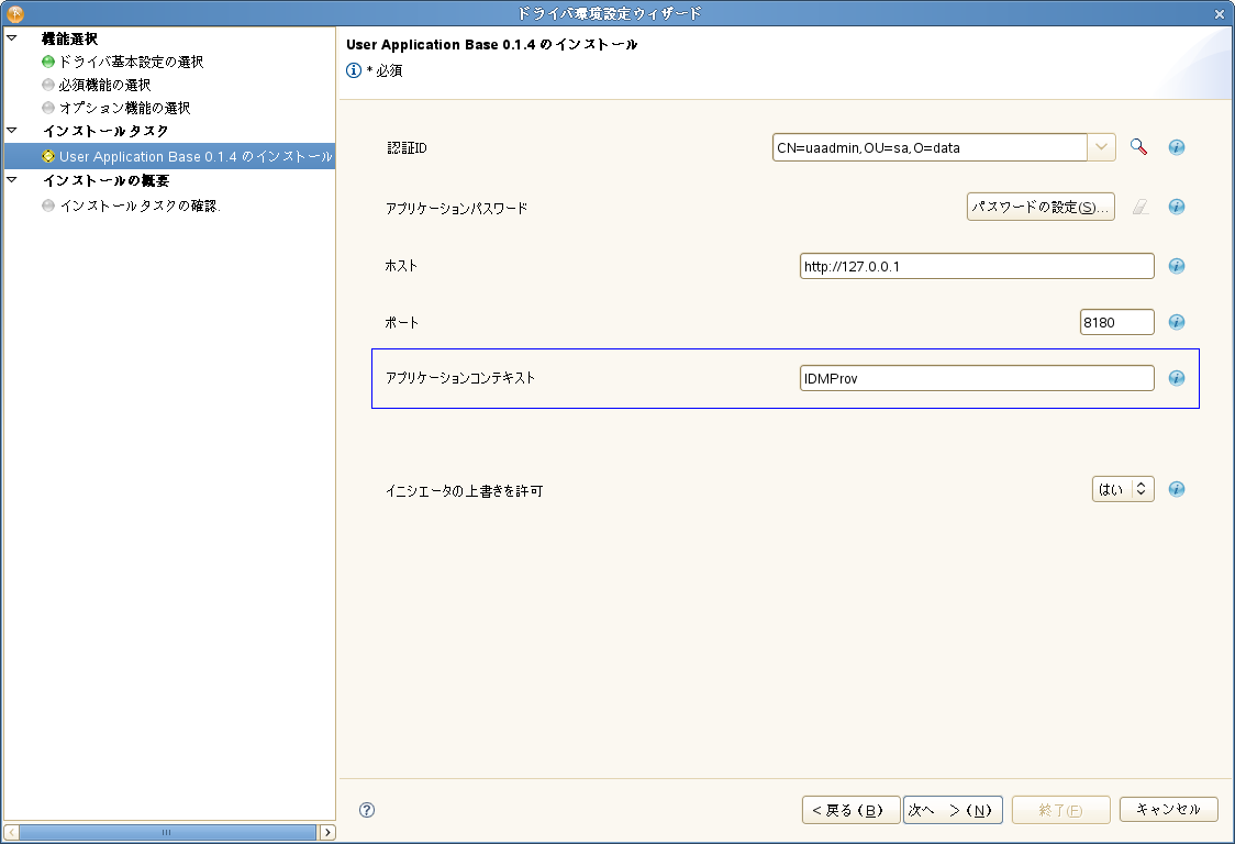 ベースコンテナのDNと作成したユーザアプリケーションドライバを指定します。ドライバがまだ展開されていないので、ブラウズ機能では設定したばかりのユーザアプリケーションドライバは表示されません。したがって、ドライバのDNを入力する必要があります。