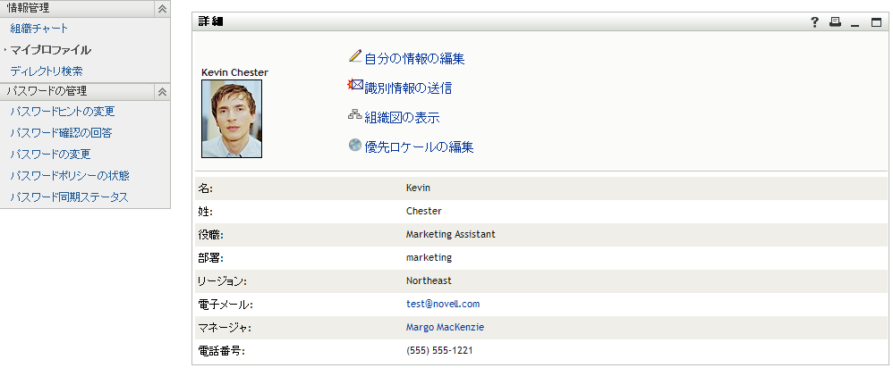 [マイプロファイル]ページでは、自分のユーザアカウントに関する詳細情報を表示したり、必要に応じてその情報を編集できます。 たとえば、以下はKevin Chester (マーケティングアシスタント)が「マイプロファイル」ページに移動した際に表示される内容です。