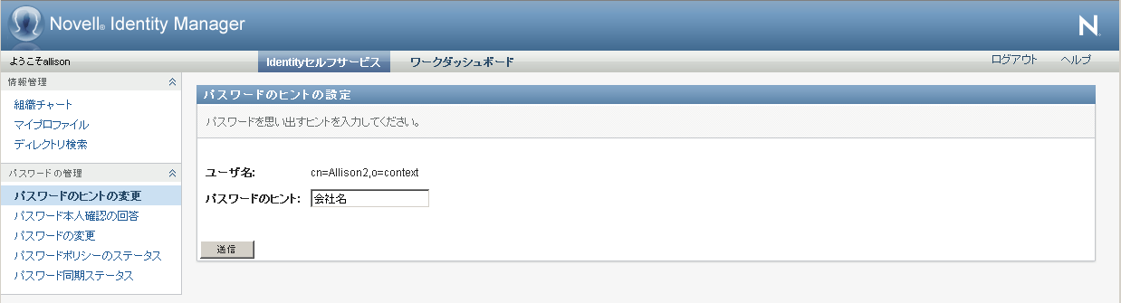 パスワードヒントは、ログイン時に自分のパスワードを忘れてしまったときに、自分のパスワードを思い出すための手がかりとして使われます。 [パスワードヒントの変更]ページで、自分のパスワードヒントを設定および修正できます。