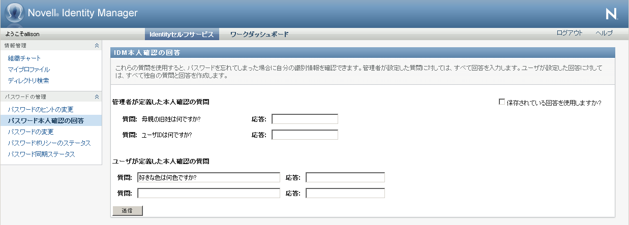 本人確認の質問は、ログイン時に自分のパスワードを忘れてしまったときに、自分が正規ユーザであることを証明する目的で使われます。 システム管理者によって設定されたパスワードポリシーにおいて、この機能が自分に対して有効になっている場合、[パスワード確認の回答]ページで次の作業を実行できます。
