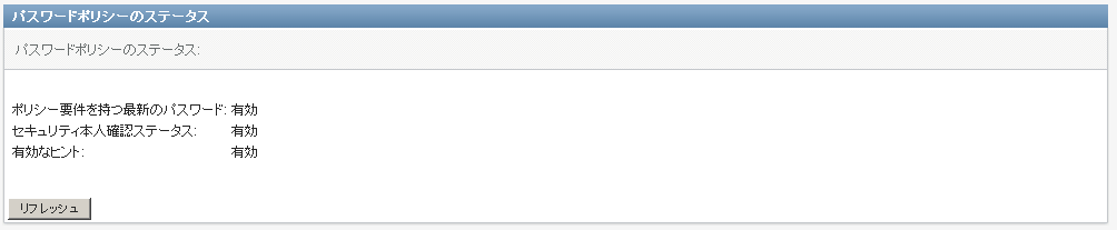[Identityセルフサービス]タブのメニューで、[パスワードの管理]カテゴリにある[パスワードポリシーの状態]をクリックします。すると[パスワードポリシーの状態]ページが表示されます。次に例を示します。
