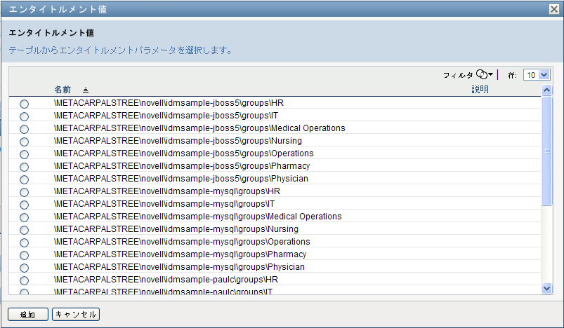 リソースにエンタイトルメントパラメータ値が必要な場合、[オブジェクトセレクタ]を使用して、次に示すように、このリソース割り当てで使用する値を選択します。