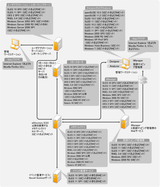 Novell Identity Managerコンポーネントは複数のシステムおよびプラットフォームにインストールすることができます。