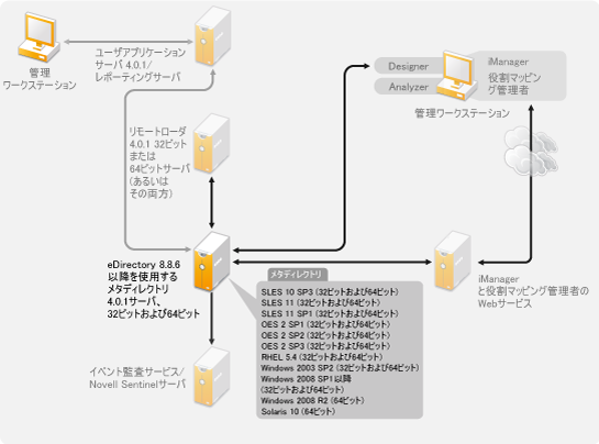 eDirectoryのシステム要件については、『Novell eDirectory 8.8 Installation Guide』を参照してください。iManagerのシステム要件については、『iManager 2.7 Installation Guide』の「Installing iManager」セクションを参照してください。