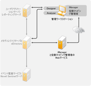 図 3-2で説明されているように、Identity Managerソリューションの主な管理ツールは、DesignerとiManagerの2つです。DesignerはIdentity Managerソリューションの計画および作成中に使用し、iManagerはIdentity Managerソリューションの日常的な管理タスクに使用します。