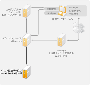 Identity Managerソリューションの一環として監査とレポートが必要である場合、Identity AuditまたはNovell Sentinelを実装する必要があります。図 3-8に示すように、独自のサーバ上でイベント監視サービスかSentinelのいずれかを実行する必要があります。ソリューションに必要なサーバの数は、現在の環境内にあるドライバの数と、監査するように定義したイベントの数によって決まります。
