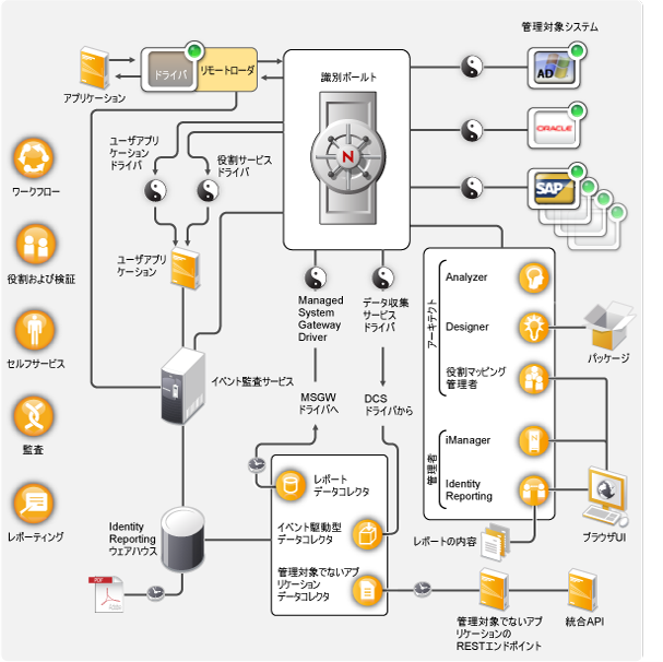 次の図は、データ同期、ワークフロー、役割、検証、セルフサービス、監査/レポートなど、セクション 1.0, Identity Managerおよびビジネスプロセスの自動化で紹介されているNovell Identity Managerの機能を提供する高レベルなアーキテクチャコンポーネントを示しています。