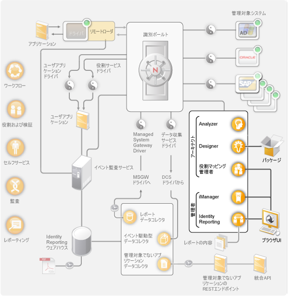 Designerを使用して、Identity Managerシステムをオフライン環境でデザイン、作成、および設定し、ライブシステムに変更を展開します。また、Designerは、Identity Managerのドライバポリシーを事前設定したり、カスタマイズしたりするためのパッケージ管理機能を提供します。データを分析、クリーンアップ、および同期用に準備するためのIdentity Managerソリューションを構築する場合には、Analyzerが使用されます。