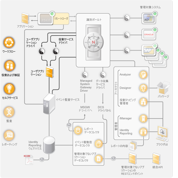ユーザアプリケーション: ユーザアプリケーションはブラウザベースのWebアプリケーションで、ユーザおよびビジネス管理者に、さまざまな識別セルフサービスおよび役割のプロビジョニングのタスクを実行する機能を提供しています。このタスクには、パスワードおよび識別データの管理、プロビジョニングおよび役割の割り当て要求の開始および監視、プロビジョニング要求の承認プロセスの管理、検証レポートの確認などがあります。これには、アプリケーションの承認プロセスを通じて要求のルーティングを制御するワークフローエンジンがあります。