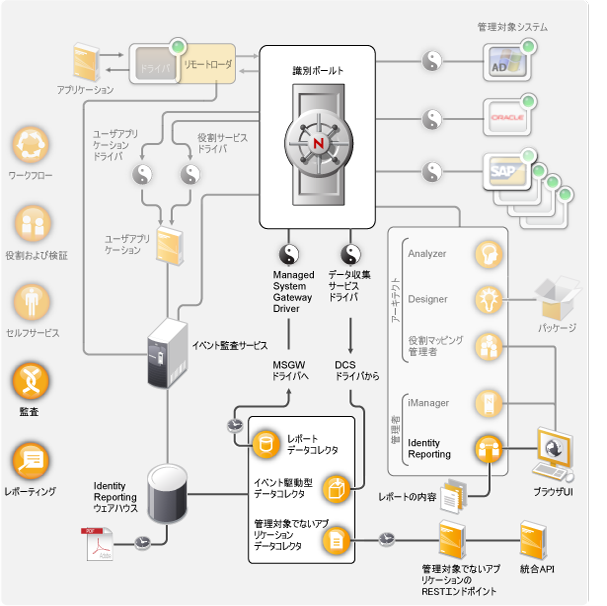 Identity Reportingモジュールは、Identity Managerの 設定のさまざまな側面に関する重要なビジネス情報を表示するレポートを生成します。これには、識別ボールトおよびActive DirectoryまたはSAPなどの管理対象システムから収集された情報も含まれます。Identity Reportingモジュールでは、次のコンポーネントを使用してデータを管理します。