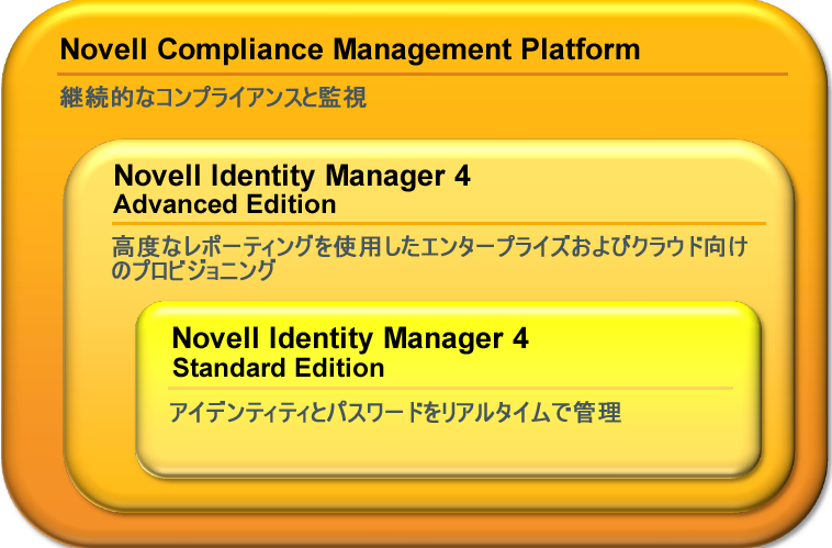 Advanced EditionとStandard Editionで利用できるIdentity Managerの機能を比較するには、「Identity Manager Version Comparisonhttp://www.novell.com/products/identitymanager/features/identitymanager-version-comparison.html」を参照してください。