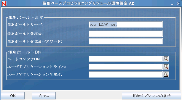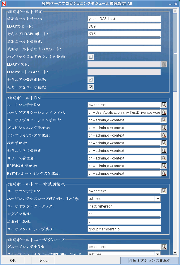 [役割ベースプロビジョニングモジュール環境設定]パネルのデフォルトのビューでは、これらの6つのフィールドが表示されます。